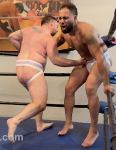 Jocks in jocks! Jonny and Danny know each other from the wrestling world, but have never shared a ring. Until now. Repeated gut punches, and spanks. Some over the top, some more grounded. Throw in some low blows and some very close up angles of each wrestler doubled over in pain suffering and there isn’t much left to the imagination. Which pro wears their undergear the best?