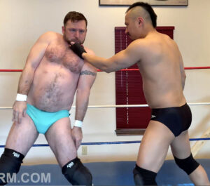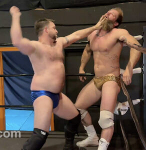 These two aren’t strangers to one another. And we’re glad, because Mickey can take on hell of a beating, and he looks good doing it! A handful of man pouch starts off poor Mickey’s decent down jobber road. Jonny enjoys thrashing Mickey and it shows. Repeatedly wedging him, grabbing and slapping his butt, even reaching inside his trunks to get a better squeeze. Jonny pulls out some pretty fun submissions, even one involving a bench! Mickey is down, but enjoying it. He worships Firestorm as he towers over him, running his mouth over his powerful calves. Power is exactly what Jonny displays during this match, executing a stalling suplex, as well as on overhead press slam. Mickey gets dominated thoroughly during this hot hotel encounter.