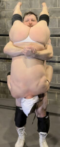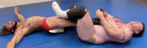 This match starts right in the thick of things. No stretching, no banter, no long posing sessions. We open with Jonny already in Brutal Brendan’s tight head scissor. His trunk like long legs squeezing Jonny’s neck into submission. This bout is exclusively full of head scissors & smothering pins. Brutal gets the tide turned on him, and is brutalized by Jonny’s thick quads. Jonny hits every variation of the scissors imaginable and makes full use of the matroom while doing so. Brendan gets KO’ed and gets a face-full of Jonny.