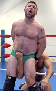 Austin and Jonny have a long, somewhat complicated history. Sometimes friends, often times rivals. But in the wrestling brotherhood almost anything can be put aside (temporarily) if it means two established stars in the underground wrestling world can join forces to dominate and humiliate one of the newest stars on the scene. So even though Jonny claims he’s going to call this match right down the middle, we all know better, Dio should know better. It’s a best 3 out of 5 falls match. Jonny tries his best to give Austin every advantage he can but Dio still manages to pull out a victory. The hotshot hunk decides to take a selfie over Austin’s defeated body, which just doesn’t sit right with either veteran wrestler. Just so things don’t get too out of hand Jonny decides to get involved physically. Now being wrecked by both men, Dio has no chance. To make matters worse they start taking selfies together over his battered body when his “daddy” calls. Austin picks up and tells him that the KO’ed hunk is drunk at the wrestling gym and he’d “take care of him” till he showed up to get him. When somebody does come to collect Dio, he certainly fits the bill of a daddy, and he punishes poor Dio on the spot.