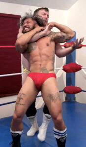 “I can’t wait to tombstone your head through that canvas” Jonny says as he cockily jabs a finger into Manny’s chest. Not the best move if you’re somebody who prioritizes self preservation. Manny plays it cool and Jonny takes a minute to admire the big man’s muscles. This match is full of piledrivers. Tombstone, reverse tombstone, normal piledrivers, cradle piledrivers, if these two can find a way to drop their opponent on their head, they’re going to take it. Can Jonny’s experience overcome Manny’s raw power? Or has the cocky heel bitten off more than he can chew? Singlets get stripped down to trunks and both men aren’t afraid to use low blows. Manny enjoys school boy pinning Jonny and showing him his muscles aren’t the only hard thing he should be worshiping.